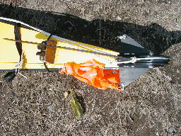 どうも、九十九里で転んだ時に、砂浜に舵が当たったらしい。そういえば、河童が立っていたところが腰ぐらいの深さで、船首をもって沖の方に船を立てて支えていたのだが、後ろの方はもっと浅いはずなので、波が引いた時に当たった可能性は十分にある。舵は、船の真ん中までロープが引っぱってあって、そのロープを引けばくるっと回ってデッキの上がるようにできているのだが、このときは船首をつかんでいるだけでも大変で、とてもロープまで手が伸ばせるような状況ではなかった。