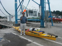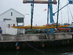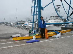 さて、かわうそ号であるが、実は那珂湊マリーナにはちゃんとしたスロープがない。一応、スロープらしき岸はあるのだが、コンクリートではなく泥で、ここへかわうそ号を降ろして、さらに荷物を詰め込むとなると一苦労である。そこで、社長にお願いして、なんと、あの大型クレーンでかわうそ号を降ろしてもらうことになったのである。どのクレーンかは、那珂湊マリーナのページに写真が出ているので参照されたいが、14トンまで吊れるクレーンである。こんなクレーンでカヌーを降ろすなど、たぶん日本で初めての事であろう。というより、まずやってくれるマリーナがないと思うけど。