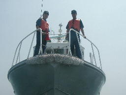 ところが、である。福島第一原発の前に来た時、遠くを通っていた巡視艇がこちらに向かって来るではないか! ん〜、いつもの監視かなあ、などと思っていると、それどころではない距離に近づいてきて、船首に人が出てきた。うわっちゃ〜、ついに河童捕獲か? やっぱり、原発の前を通る時は、ちゃんと連絡した方が良かったのだろうか?