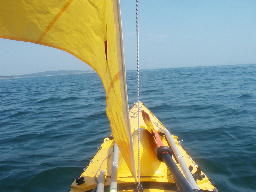 | 少しだけセーリングできた。 アウトリガーなし。この後、ハリヤードが絡んで下ろせなくなる。 しかも、いい風は1時間も吹かなかった。 |