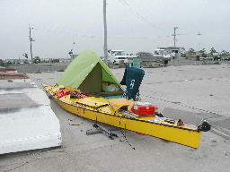 | 鳥の海でのかわうそ号。 テントは縛り付けてある。 昨日は飛びそうだった。 |