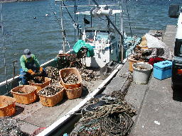 | 港では、養殖のカキをさばいていた。 最近、宮城では韓国産のカキを宮城産に 偽装していた事件がばれて大変なのだが、 これは本物の宮城産。 |