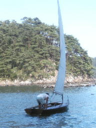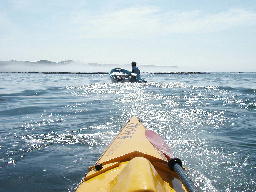 さて、そして今朝、気仙沼湾東側にはガスがかかっていた。どうしようか迷ったのだが、岬の先までは夢也さんに曳航してもらえると言うことで(岬の先端まで6キロある)とりあえず出てみた。ところが、岬の先端に近づくにつれガスは濃くなっていき、ボートに引っぱられる河童には何も見えない。しかも、先に進むにつれてうねりが高くなってきた。岬の先端の港に入って様子を見ようかと思ったのだが、この港がまた役立たずの港で、南側の防波堤でくずれたうねりで、入り口の半分が白くなっている。しかも、入り口北側には岩礁が、また真っ白になっているではないか。とてもではないが、かわうそ号で入っていけるような状況ではない。