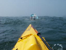 | 帰る時。 うねりとガスでな〜んにも見えない。 動力船は逃げる余裕があるので、 けっこう岩礁に近づいても平気だが、 こっちは逃げる余裕がないので怖いのだ。 まあ、河童が臆病なせいもあるけど。 |