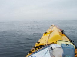 ところが、波の悪い吉浜湾を出て、死骨崎の沖に仕掛けられた定置網の上を抜けると(実はこのロープの上に、どういうわけかかわうそ号がのっかってしまい、もう少しで危ないところだった)強い追い風が吹いていた。これ幸いとばんばんとばして、なんと午後2時には船越入港である。海面が白くなりかけるぐらいの風が出ていて、さすがにパドルがはなせなかった(ようするに休憩がとれなかった)が、柄沢さんに作ってもらった特大サイズのラダーがよくきいて、うねりの中でも進路を保てたのが大きい。やはり、ラダーはでかい方がいい。
