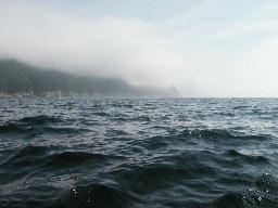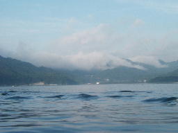 | このあたりの気象はよくわからない。 これも、山の中腹からガスがかかっている。 風は山の左から右に吹いている。 水温20度であった。 |