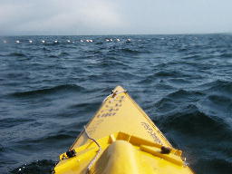 | これが吉浜湾を出るところにあった定置網。 まさかこのあと、このロープにのっかって、 身動きがとれなくなるとは思ってもいない。 |