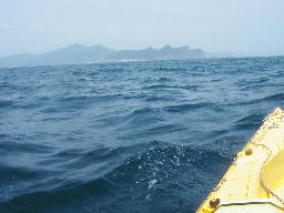 | 吉浜湾内の波。 ずっとこんなふう。 岩に当たって跳ね返ってくる波と干渉して こうなっているのか、海底の形状なのか、 さっぱり理由がわからない。 結論はただひとつ。こぎにくい。 |