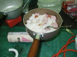| 今日の夕食。 昼にご飯を炊いたので、残りご飯を使って チャーハンを作った。中身は魚肉ソーセージ。 |