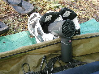 | 濡れてしまったクツをドライヤーで 乾かしている。 発電機があると、いろいろなことができる。 |