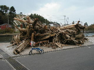 | 定置網にかかった流木。 手前の自転車を見ると、どれぐらいの量か よくわかる。ひでえ。 |