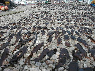 そこで、朝昆布をならべるのを手伝ったのだが、いやこれが重労働だった。濡れている昆布はけっこう重くて、それを一抱え手にして、一枚一枚ならべていくのだ。重なるとくっついてしまったり、乾きが悪くなるので、かなり気をつかいながらならべないといけない。足元は、砂利がしいてあってでこぼこだし、そんな中、中腰になって昆布をおいていくのである。1時間半ほどかかって、とりあえずある分は並べ終わった。一面昆布だらけである。
