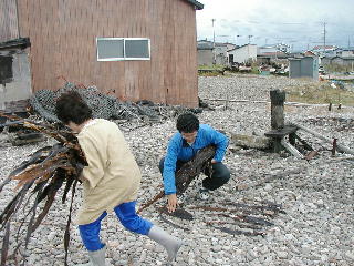 | 乾燥した昆布を集めているところ。 朝、せっかく並べた昆布を回収しないといけない。 すべて人手に頼るという作業。 |
