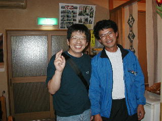 | もどき吉岡さんと記念撮影。 二人とも、すっかりごきげんである。 いやいや、こうして友人が増えていくのは、 旅の快感なのだ。 大間崎到達を記念して、これまでお世話になった人に 絵葉書を書いたのだが、書けども書けども終わらなくて いろいろな人に世話になったと実感した。 ども、いろいろありがとね。 |