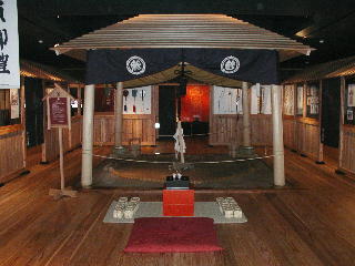 さて、どんなんであろうかとクツを脱いで2階に上がっていくと、いきなりすだれのかかった入り口がある。両側に「鰺」という文字がついた提灯がぶら下がっていて、確かに相撲部屋風である。のれんをくぐって中にはいると、真ん中にどーんと土俵が作ってある。その周りの廊下に、舞の海の説明があって、いろいろな記念品がおいてある。なにしろこの町では、舞の海は「舞の海」ではなく「修平」なのであって、当然幼少期、というより生まれたときの写真から資料がそろっている。ビデオでは舞の海の取り組みが延々流れていて、これが結構おもしろい。やはり、舞の海という力士の取った相撲というのは、何が起きるかという期待があり、今見返してもなかなか楽しめるのだ。