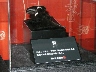 そこを過ぎて、5歩歩いて思わず立ち止まった。ガラスケースの中に、なにやら黒い固まりが入っている。なんじゃ、これは? 説明を読んで吹き出した。なんと、この黒い物体は、舞の海のマゲであった! そりゃ、引退のセレモニーで断髪式なんてのがあるぐらいだから、力士にとって重要なものなのかもしれないが、まさかこんなものが展示されているとは思わなかった。いやいや、これはすごい。