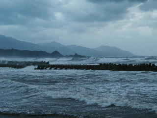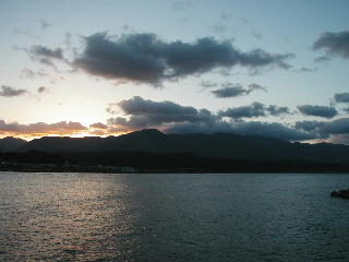 | 岩崎村の夜明け。 雲がかかっているのが白神岳。 当然、寒い! |