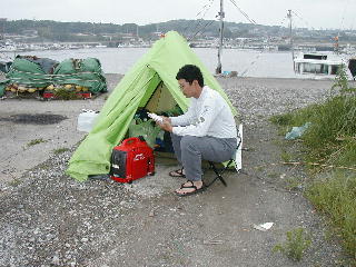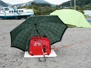 ご存じの通り、今年の東北は雨が多く、キャンプも雨に閉じこめられることが多かった。当然、テントの中でじっとしているのだが、この時、テントの前にフライをかけて、その中で発電機を回していた。発電機の横、1メートルのところでパソコンをたたいていたのだ。それでも、うるさくてしかたがないというような印象がない。晴れた時に、いろいろ実験してみたのだが、テントから10メートル離すと、テントの中でかけっぱなしになっているラジオの方が大きくなり、15メートル離すと、ラジオを切っても音がわからなかった。町の中ではなく、夜になると誰もいなくなる港でもこんなものだ。
