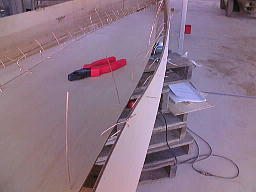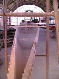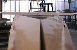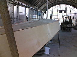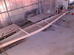 | ひっくり返して、正立させた船体。 上にのせてある棒は、船体のねじりを見るためにのせてあります。 |