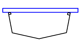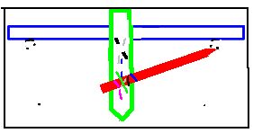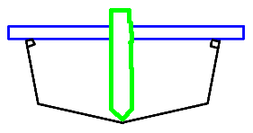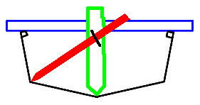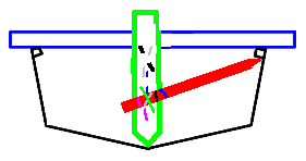 | 次に、船体深さの板(あまった合板がいい)をキールラインに あわせ、上の棒と瞬間接着剤でくっつけます。 キールラインにあわせる所は、図のように三角に切っておきましょう。 そうしないと、キールラインにあいません。 |